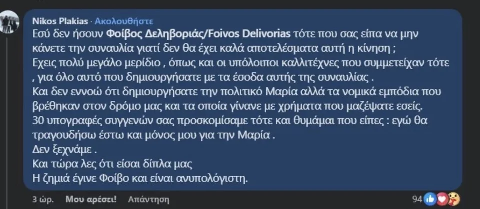 Τριάντα υπογραφές συγγενών σας προσκομίσαμε τότε και θυμάμαι που είπες: «Εγώ θα τραγουδήσω έστω και μόνος μου για τη Μαρία». Δεν ξεχνάμε. Και τώρα λες ότι είσαι δίπλα μας. Η ζημιά έγινε Φοίβο και είναι ανυπολόγιστη» ανέφερε στην ανάρτησή του ο Νίκος Πλακιάς.