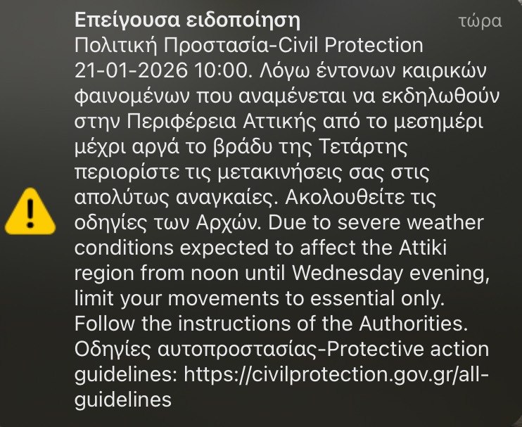 «Λόγω έντονων καιρικών φαινομένων που αναμένεται να εκδηλωθούν στην Περιφέρεια #Αττικής από το μεσημέρι μέχρι αργά το βράδυ της Τετάρτης περιορίστε τις μετακινήσεις σας στις απολύτως αναγκαίες» αναφέρει το μήνυμα.