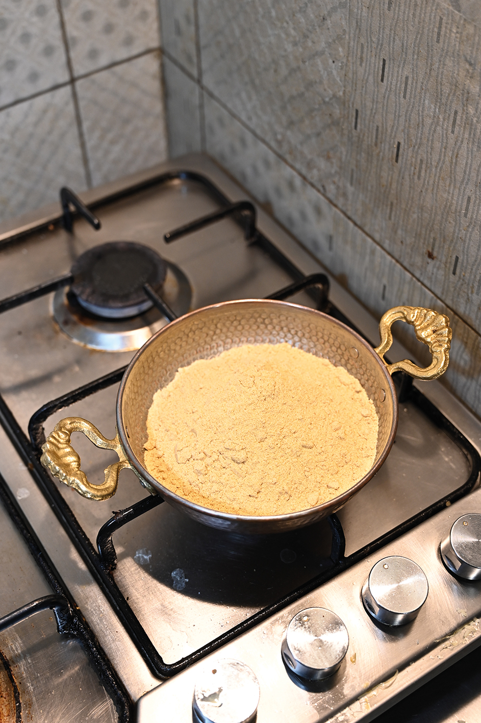 Το φούρνικο αλεύρι, βασικό συστατικό της τυροκλωστής, θέλει συνεχώς ανακάτεμα πάνω σε χαμηλή φωτιά. Φωτό: Γιώργος Καπράνος