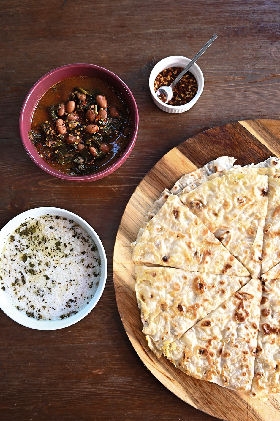 Τρία πιάτα-σήμα κατατεθέν της ποντιακής κουζίνας: φασόλια με μαύρα λάχανα, περέκ με τυρί και τανωμένος σορβάς. Φωτό: Γιώργος Καπράνος