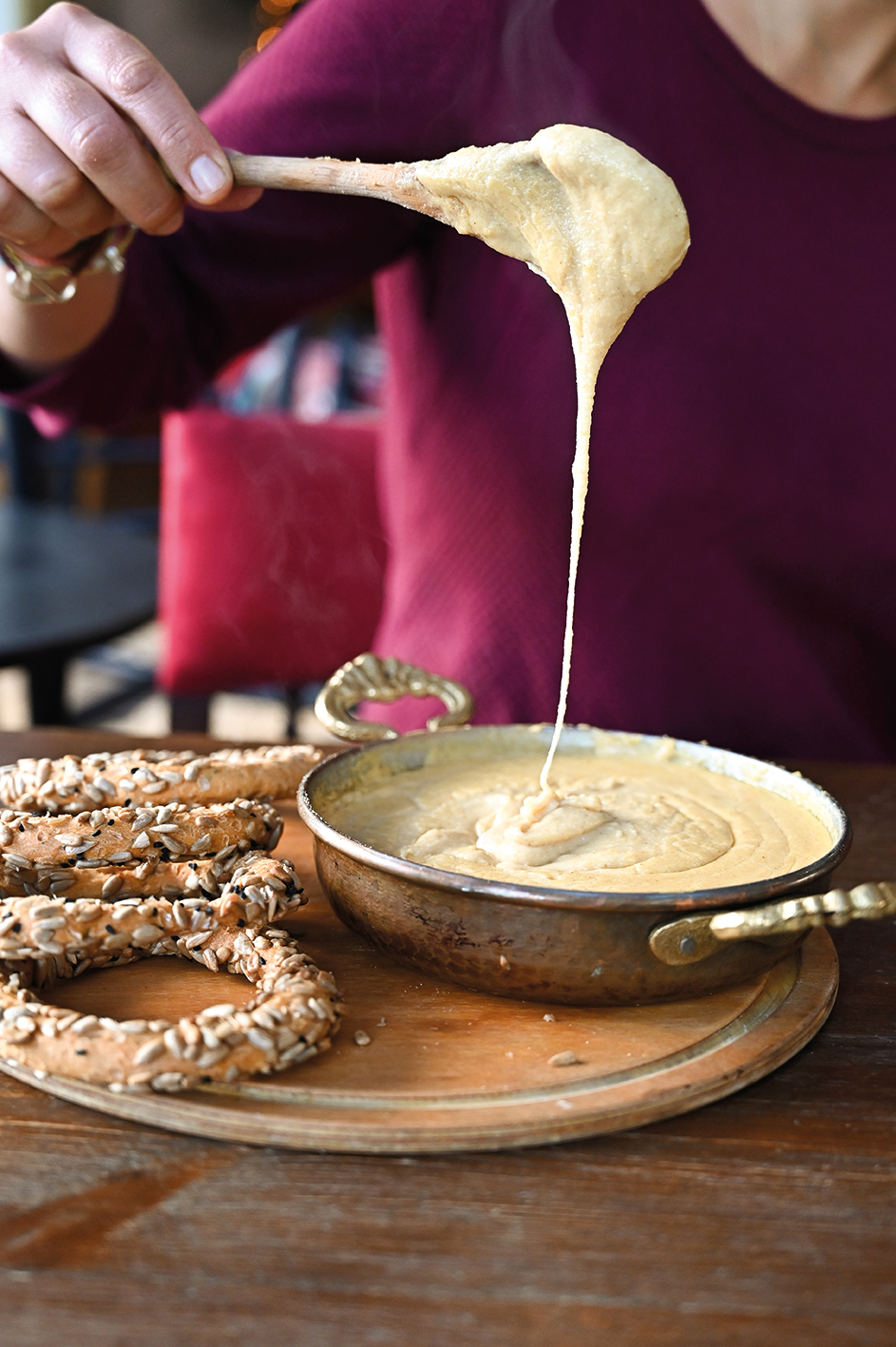 - Όταν σηκώνουμε την κουτάλα και το τυρί ρέει σαν κλωστή, αποσύρουμε το σκεύος από τη φωτιά και σερβίρουμε αμέσως, συνοδεύοντας με κριτσίνια ή ζυμωτό ψωμί.