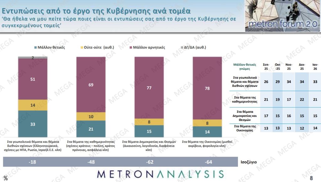 Ακόμη πιο αρνητική είναι η εικόνα στους τομείς της Δημοκρατίας και των Θεσμών, όπου το 77% αξιολογεί αρνητικά το κυβερνητικό έργο, ενώ μόλις το 15% εκφράζει θετική άποψη, καθώς και στην Οικονομία, όπου οι αρνητικές γνώμες αγγίζουν το 78% και το ισοζύγιο υποχωρεί στο -64.