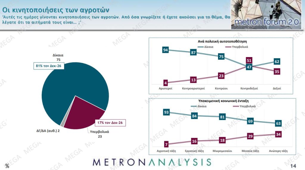 Ειδικότερα, στην ερώτηση: «Αυτές τις ημέρες γίνονται οι κινητοποιήσεις των αγροτών. Από όσα γνωρίζετε ή έχετε ακούσει για το θέμα, θα λέγατε ότι τα αιτήματά τους είναι…;», το 75% απάντησε “δίκαια”, το 23% “υπερβολικά”, ενώ το 2% “Δεν ξέρω/ Δεν απαντώ”.