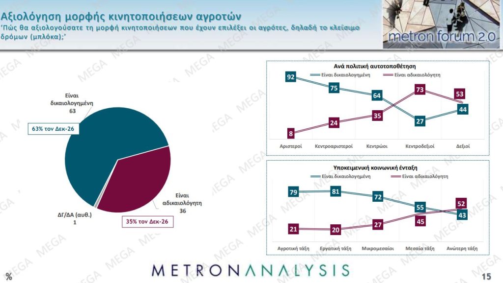 Στην ερώτηση: «Πώς θα αξιολογούσατε τη μορφή των κινητοποιήσεων που έχουν επιλέξει οι αγρότες, δηλαδή το κλείσιμο δρόμων (μπλόκα);», το 63% απάντησε “δικαιολογημένη”, το 36% “αδικαιολόγητη”, ενώ το 1% “Δεν ξέρω/ Δεν απαντώ”. Στην προηγούμενη μέτρηση τα αποτελέσματα στην ίδια ερώτηση, ήταν 63% “δικαιολογημένη” και το 35% “αδικαιολόγητη”.