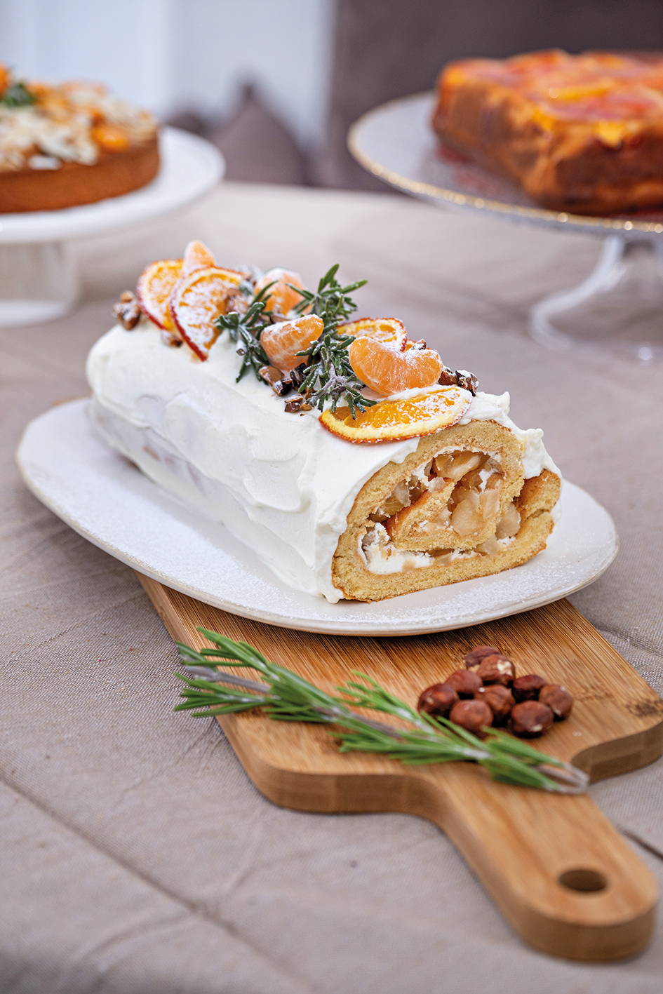 - Όταν έρθει η ώρα να σερβίρουμε, απλώνουμε στην επιφάνεια του ρολού την υπόλοιπη κρέμα και διακοσμούμε με κλημεντίνες, αποξηραμένες φέτες πορτοκαλιού, δεντρολίβανο και το τραγανό φουντούκι. Πασπαλίζουμε με άχνη και κόβουμε σε κομμάτια.