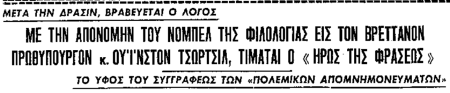 »Ο τίτλος ευγενείας που του απένειμεν εφέτος τον Απρίλιον η νεαρή Βασίλισσα Ελισάβετ, ήταν η πανηγυρική επίστεψις της πολιτικής σταδιοδρομίας του, το Βραβείον Νόμπελ είναι η επίστεψις της σταδιοδρομίας του ως συγγραφέως.