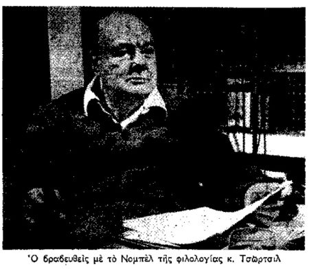 «Το βραβείον Νόμπελ διά την Φιλολογίαν απενεμήθη εφέτος εις τον Άγγλον Πρωθυπουργόν σερ Ουίνστον Τσώτρσιλ. Για τον μεγάλο Γέρο της Αγγλίας το 1953 θα μείνη ως το έτος της διπλής στέψεως: