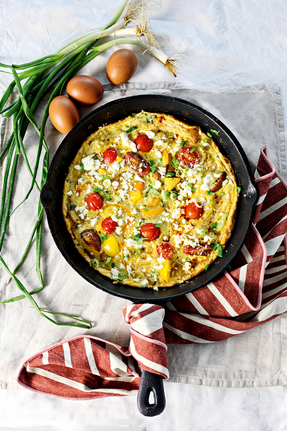 Με πατάτες, φρέσκα κρεμμυδάκια, πιπεριές, ντοματίνια και φέτα