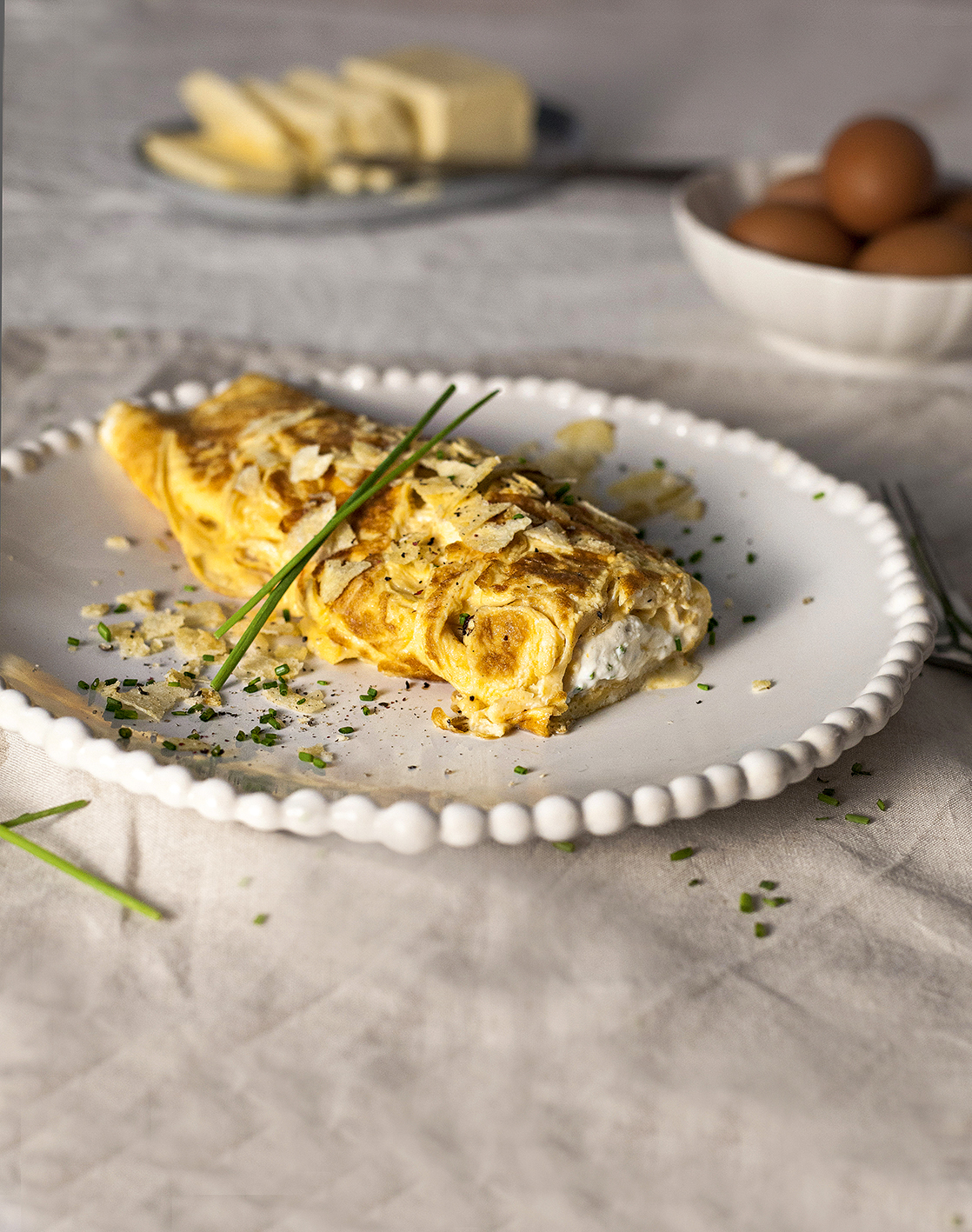 - Μεταφέρουμε προσεκτικά την ομελέτα σε πιάτο – το εσωτερικό της πρέπει να παραμένει ζουμερό και μεταξένιο. Σερβίρουμε πασπαλίζοντας με πατατάκια για έξτρα τραγανότητα και ψιλοκομμένο σχοινόπρασο.