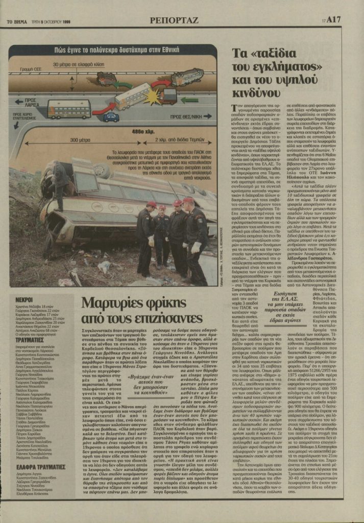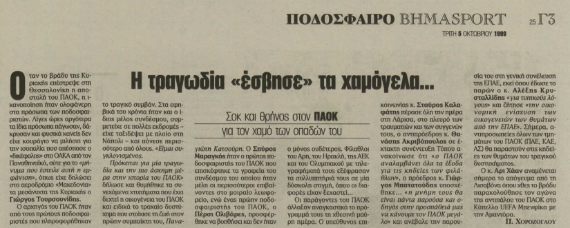 Όπως συνέβη και προ ετών, στα Τέμπη, σε ανάλογο τροχαίο, με οπαδούς του ΠΑΟΚ που έχασαν τη ζωή τους επιστρέφοντας στη Θεσσαλονίκη από την Αθήνα, μετά από παιχνίδι -για το ελληνικό πρωτάθλημα- της ποδοσφαιρικής ομάδας του ΠΑΟΚ, κόντρα στον Παναθηναϊκό.