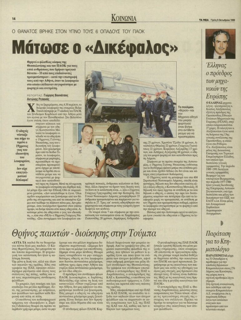 Ήταν τότε 4 Οκτωβρίου 1999 όταν έξι νέα άτομα, ο Χαράλαμπος Ζαπουνίδης (20 ετών), ο Δημήτρης Ανδρεαδάκης (25 ετών), η Χριστίνα Τζιόβα (18 ετών), ο Αναστάσιος Θέμελης (22 ετών), ο Γεώργιος Γκανάτσιος (22 ετών), ο Κυριάκος Λαζαρίδης (17) και ο Αστέριος Αγκζιώτης (68), τα οποία άφησαν την τελευταία πνοή τους στην άσφαλτο, «βυθίζοντας» στο πένθος την «ασπρόμαυρη» οικογένεια. Απώλεια που δεν έχει ξεχαστεί από τον ΠΑΟΚ, έχει χαραχθεί βαθιά στο «σώμα» του συλλόγου και τιμάται ανελλιπώς κάθε χρόνο η μνήμη των έξι «αετόπουλων».