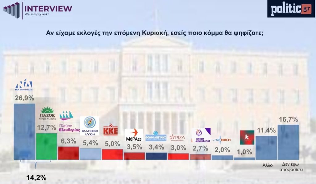 Στην εκτίμηση εκλογικού αποτελέσματος, το προβάδισμα της ΝΔ διευρύνεται, ενώ το ΠαΣοΚ εδραιώνεται στη δεύτερη θέση. Τα μικρότερα κόμματα εμφανίζουν οριακές μεταβολές, χωρίς ωστόσο να προκύπτει ανατροπή του πολιτικού σκηνικού.