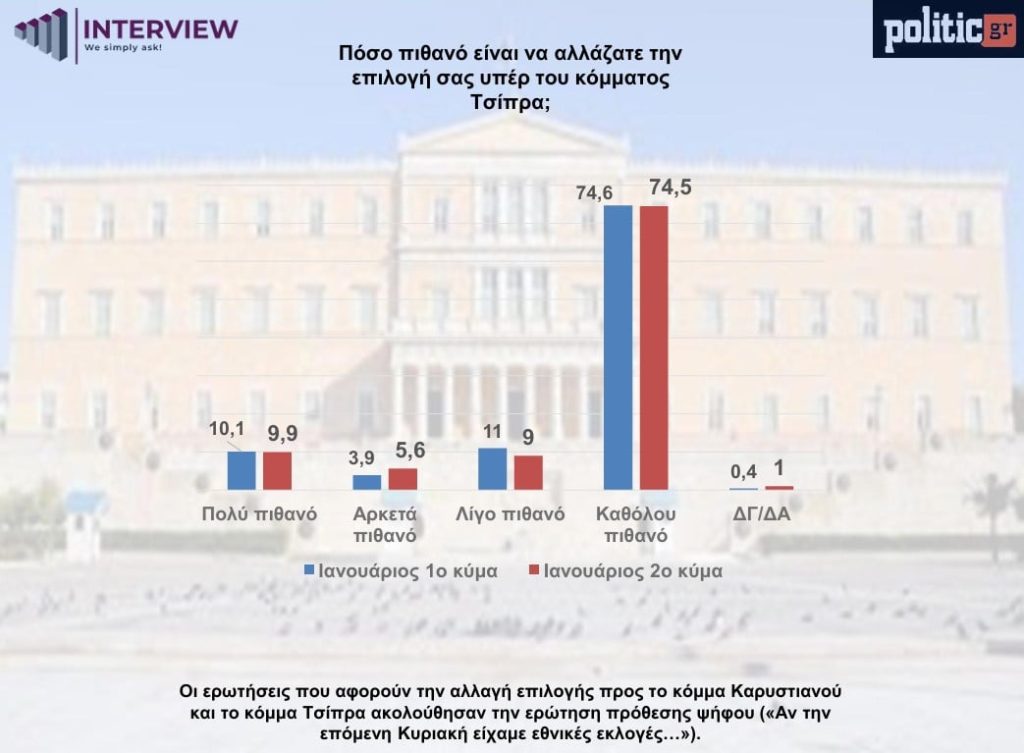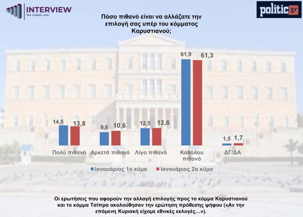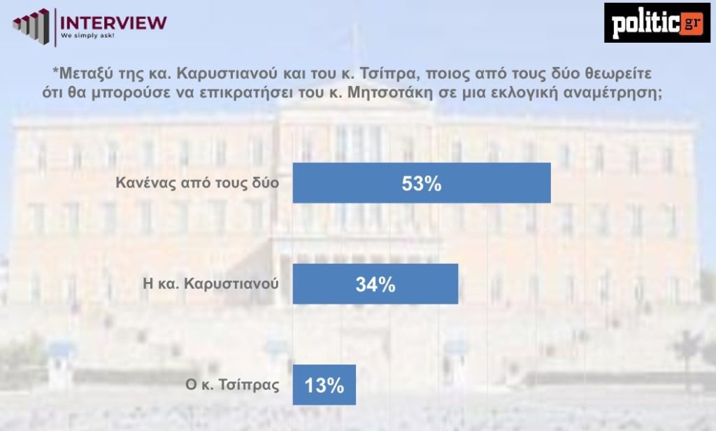 Ενδεικτικό είναι και το υποθετικό δίλημμα μεταξύ Καρυστιανού και Τσίπρα απέναντι στον Κυριάκο Μητσοτάκη: το 53% απαντά ότι κανένας από τους δύο δεν θα μπορούσε να τον κερδίσει σε μια εκλογική αναμέτρηση.