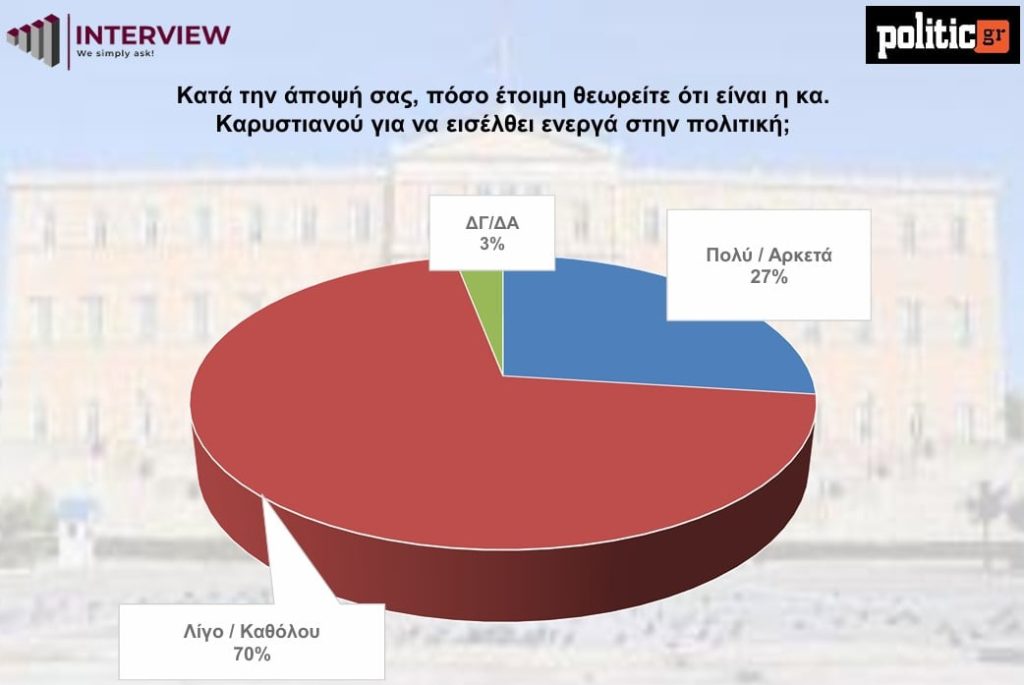 Ειδικότερα, αρνητική εμφανίζεται η πλειονότητα των ερωτηθέντων ως προς το κατά πόσο η Μαρία Καρυστιανού είναι έτοιμη να εισέλθει ενεργά στην πολιτική. Το 70% απαντά «λίγο ή καθόλου έτοιμη», ενώ μόλις το 27% θεωρεί ότι είναι «πολύ ή αρκετά έτοιμη».