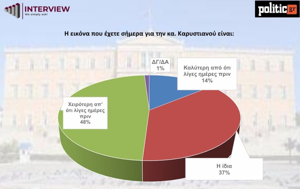 Παράλληλα, η εικόνα της Καρυστιανού φαίνεται να έχει επιδεινωθεί σε σχέση με λίγες ημέρες πριν από τα όσα είπε η ίδια για της αμβλώσεις, για σχεδόν τους μισούς ερωτηθέντες, ενώ μόνο ένα μικρό ποσοστό δηλώνει ότι η εικόνα της έχει βελτιωθεί.