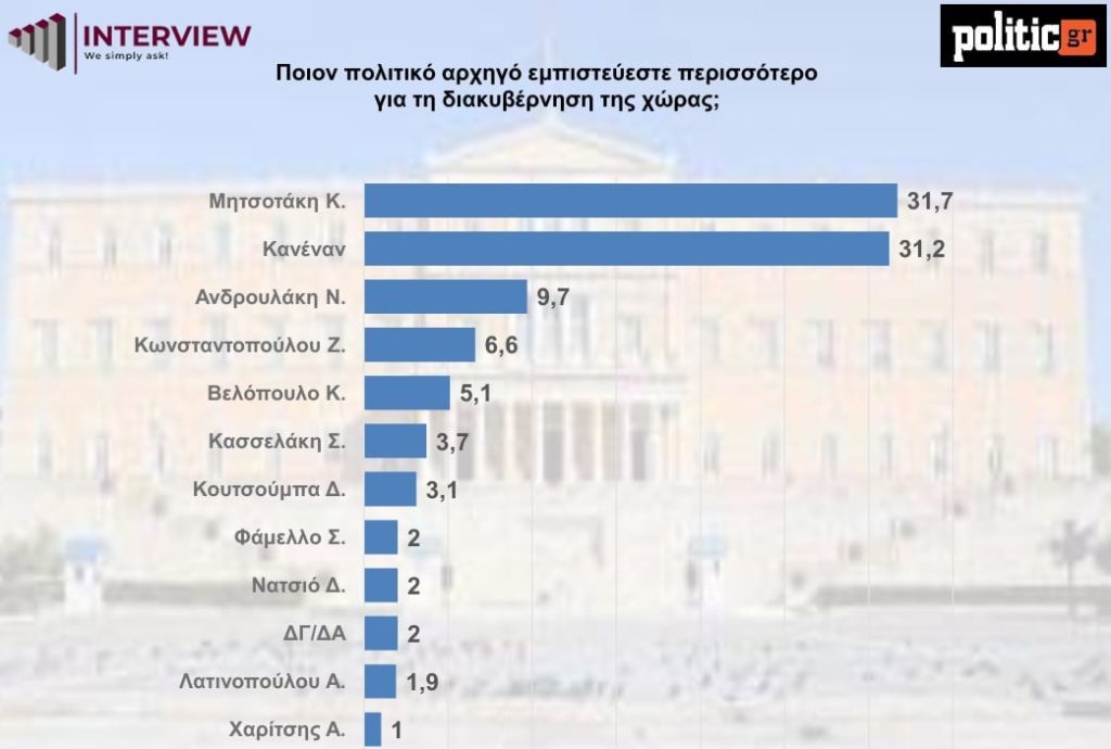 Ιδιαίτερο ενδιαφέρον παρουσιάζει το εύρημα για τον καταλληλότερο πολιτικό αρχηγό για τη διακυβέρνηση της χώρας. Ο Κυριάκος Μητσοτάκης προηγείται, ωστόσο σχεδόν ισοδύναμο ποσοστό συγκεντρώνει η απάντηση «κανένας», γεγονός που υποδηλώνει κρίση εμπιστοσύνης προς το σύνολο του πολιτικών.