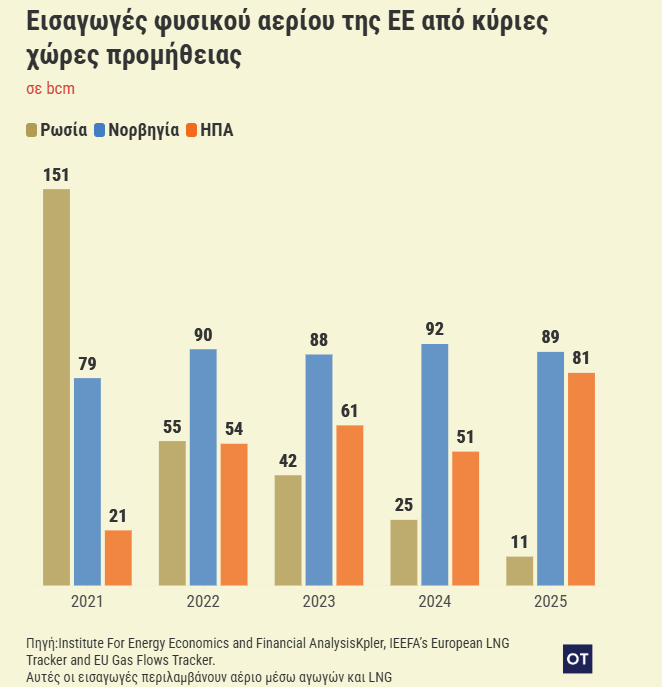 Ήδη σύμφωνα με στοιχεία του Institute for Energy Economics and Financial Analysis το αμερικανικό LNG που εισήχθη στην Ε.Ε. το 2025 αυξήθηκε στα 81 δισ. κυβικά μέτρα από μόλις 21 δισ. κυβικά μέτρα το 2021. Όταν το ρωσικό φυσικό αέριο έχει βουτήξει… το 2025 στα 37 δισ. κ.μ. από 151 δισ. κ.μ. το 2021.