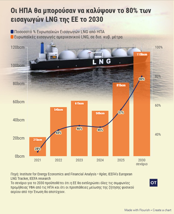 Με βάση τις 20 συμφωνίες που έχουν συνάψει αμερικανικές με ευρωπαϊκές εταιρείες (συμπεριλαμβανομένης και της Τουρκίας), όπως συνέβη τον Νοέμβριο στην Αθήνα ανάμεσα στην ATLANTIC, των AKTOR – ΔΕΠΑ Εμπορίας, με την Venture Global το αμερικανικό LNG θα μπορούσε το 2030 να αποτελεί το 80% των εισαγωγών LNG της Ε.Ε. Τη σχετική πρόβλεψη κάνει πάλι το Institute for Energy Economics and Financial Analysis.