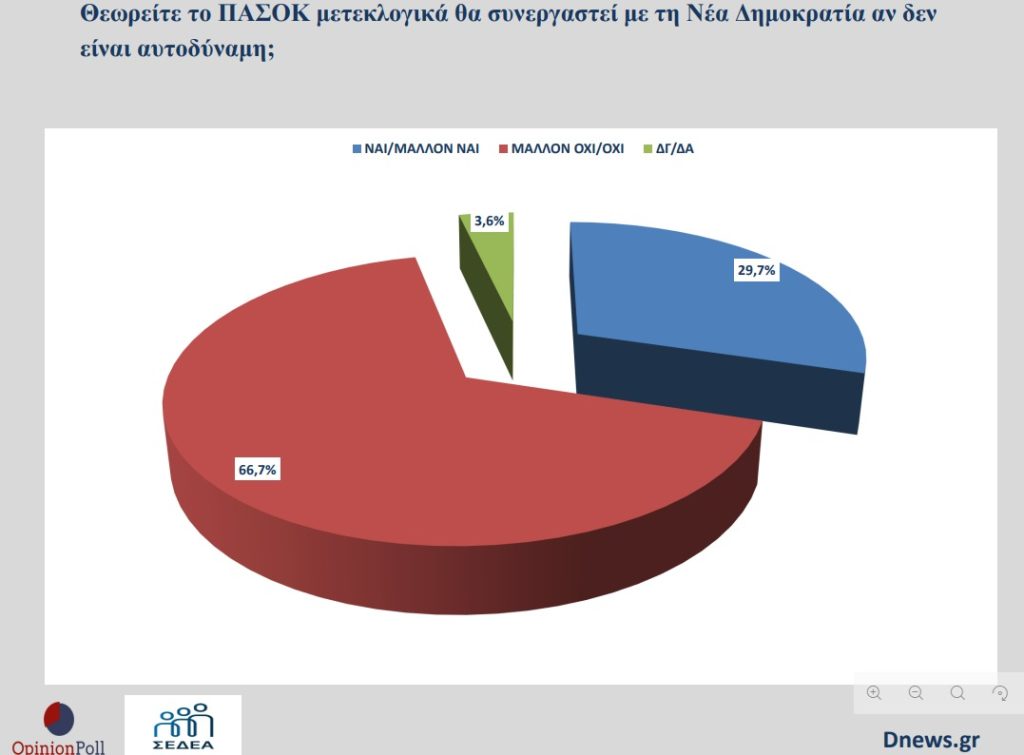 Παρά τις κατηγορηματικές διαψεύσεις της ηγεσίας, σχεδόν τρεις στους δέκα ψηφοφόρους του ΠαΣοΚ (29,7%) θεωρούν πιθανό το ενδεχόμενο μετεκλογικής συνεργασίας με τη Νέα Δημοκρατία, εφόσον αυτή δεν καταφέρει να εξασφαλίσει αυτοδυναμία.