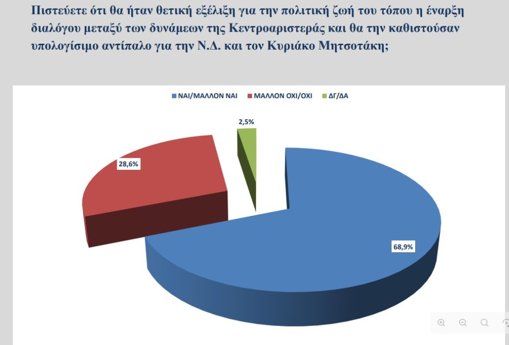 Σχεδόν επτά στους δέκα ψηφοφόρους του ΠΑΣΟΚ (68,9%) θεωρούν ότι η έναρξη διαλόγου μεταξύ των δυνάμεων της Κεντροαριστεράς θα αποτελούσε θετική εξέλιξη για την πολιτική ζωή της χώρας και θα μπορούσε να καταστήσει τον χώρο υπολογίσιμο αντίπαλο της ΝΔ και του Κυριάκου Μητσοτάκη. Αντίθετη άποψη εκφράζει το 28,6%.