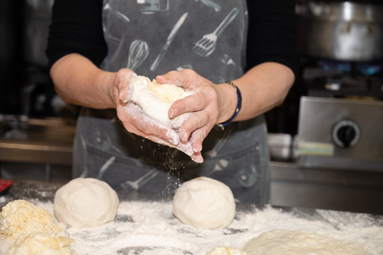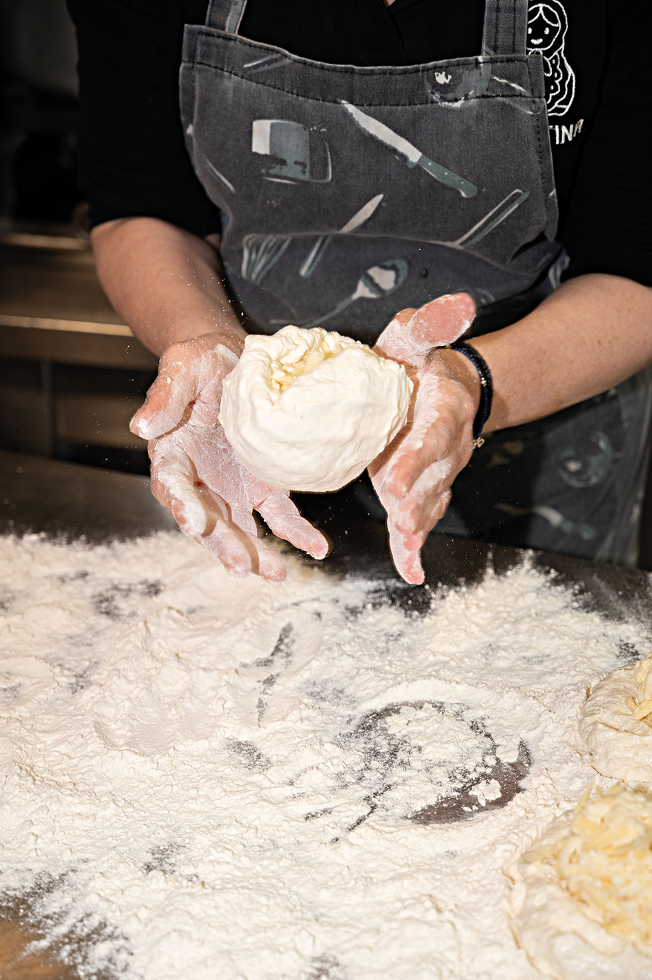 Η Ειρήνη Τριανταφυλλίδου, κόρη της Βαλεντίνας, ζυμώνει καθημερινά τα λιπιόσκα και τα χατσαπούρι που σερβίρονται στο μαγαζί. Φωτό: Γιώργος Καπράνος