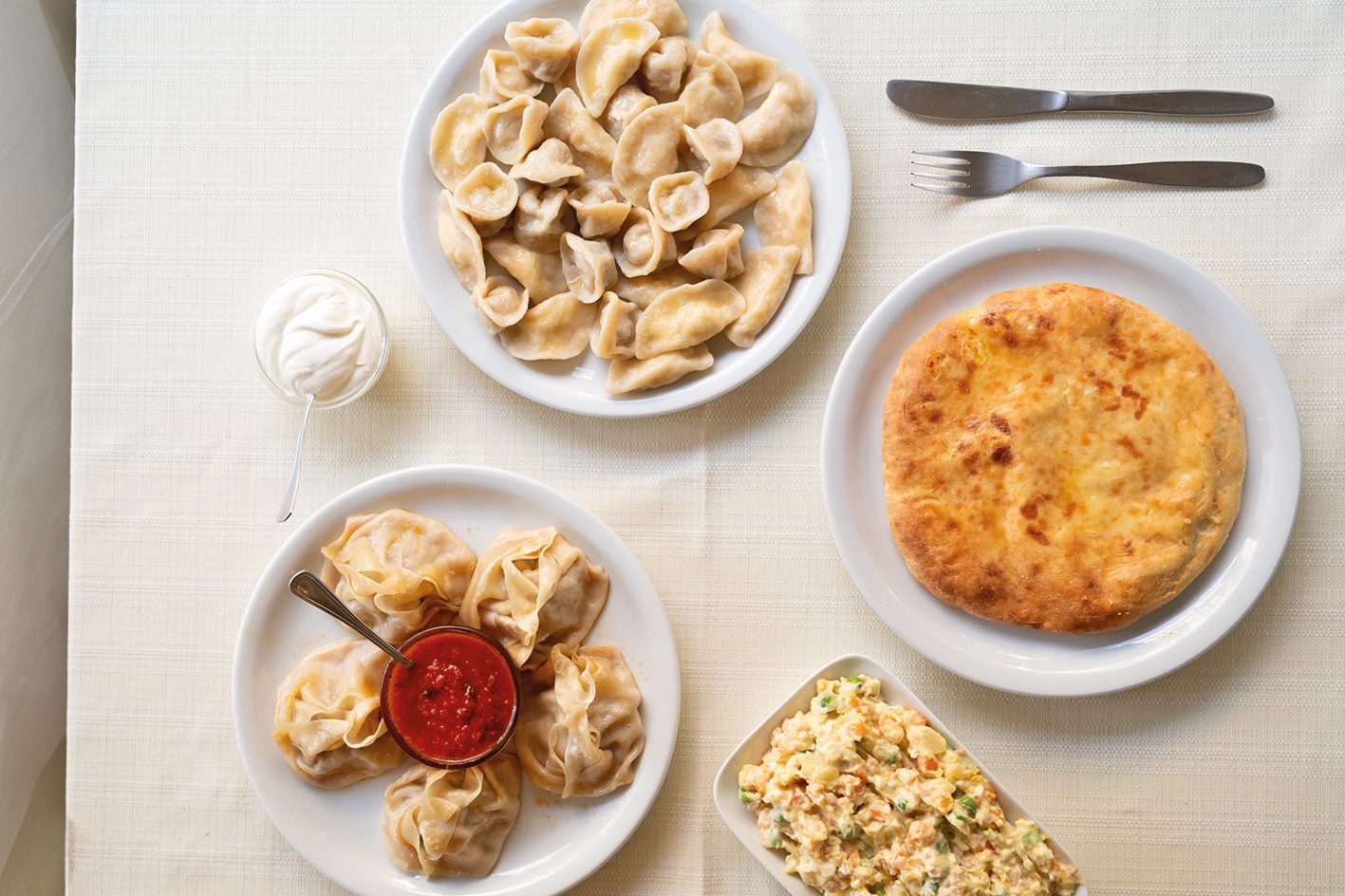 Το τραπέζι στη Βαλεντίνα στρώθηκε με χατσαπούρι, μαντί, πιλμένι, βαρένικα και, φυσικά, ρώσικη σαλάτα. Φωτό: Γιώργος Καπράνος