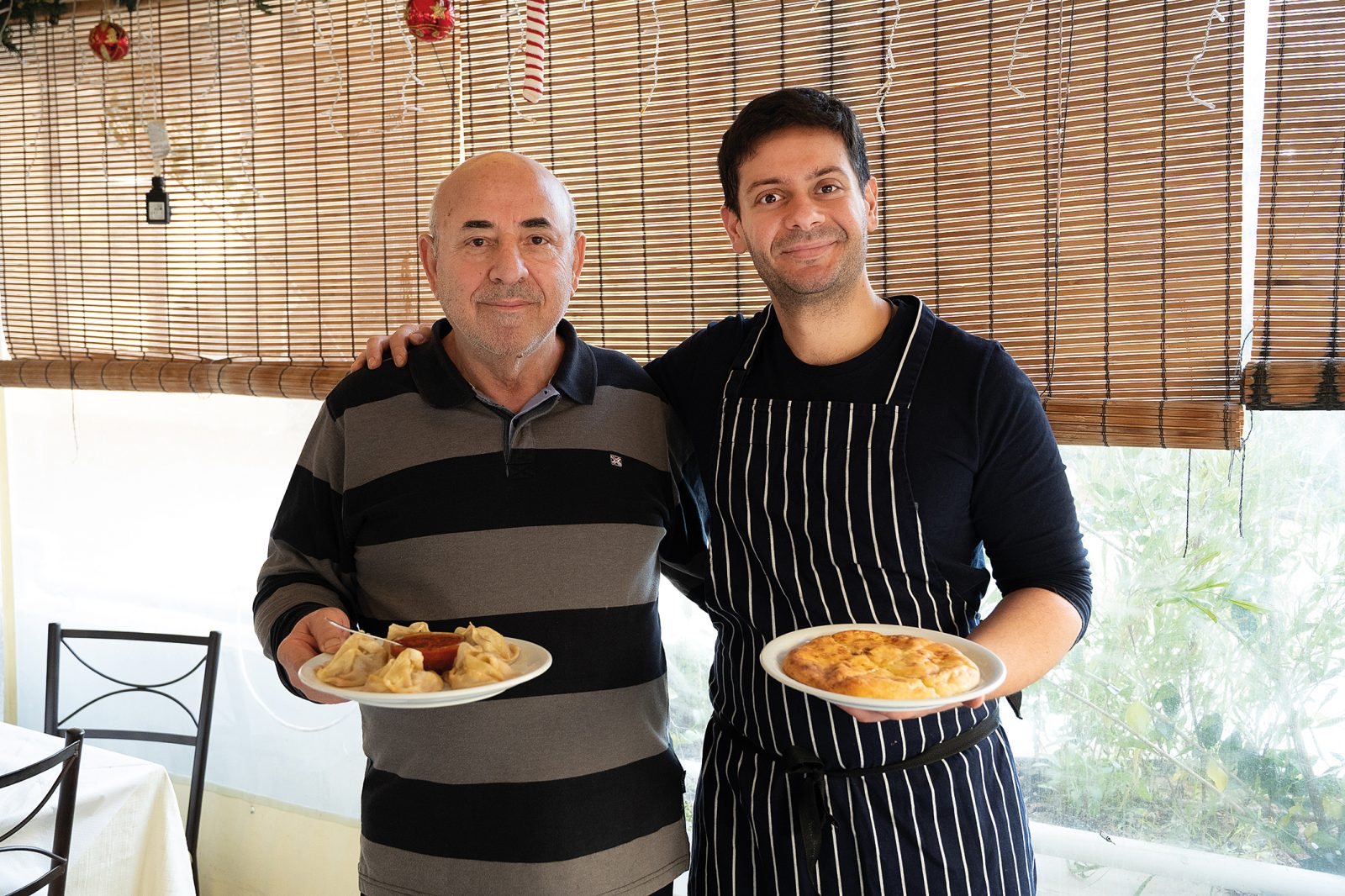 Στο τραπέζι, δύσκολα διαλέγεις. Μαντί από Καζακστάν στον ατμό, μικρά πουγκάκια ζύμης με κιμά και γιαούρτι για δροσιά. Βαρένικα (ποντιακά ραβιόλι) γεμιστά με τυρί, πιροσκί με πατάτα ή κιμά, μοσχαράκι Στρογγανόφ και ποντιακοί λαχανοντολμάδες.