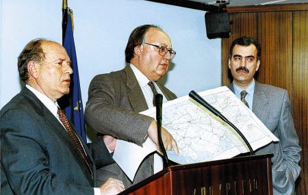 Συνέντευξη Τύπου με τους τότε υπουργούς Εθνικής Άμυνας Γεράσιμο Αρσένη και Εξωτερικών Θεόδωρο Πάγκαλο. Δεξιά, ο τότε κυβερνητικός εκπρόσωπος Δημήτρης Ρέππας