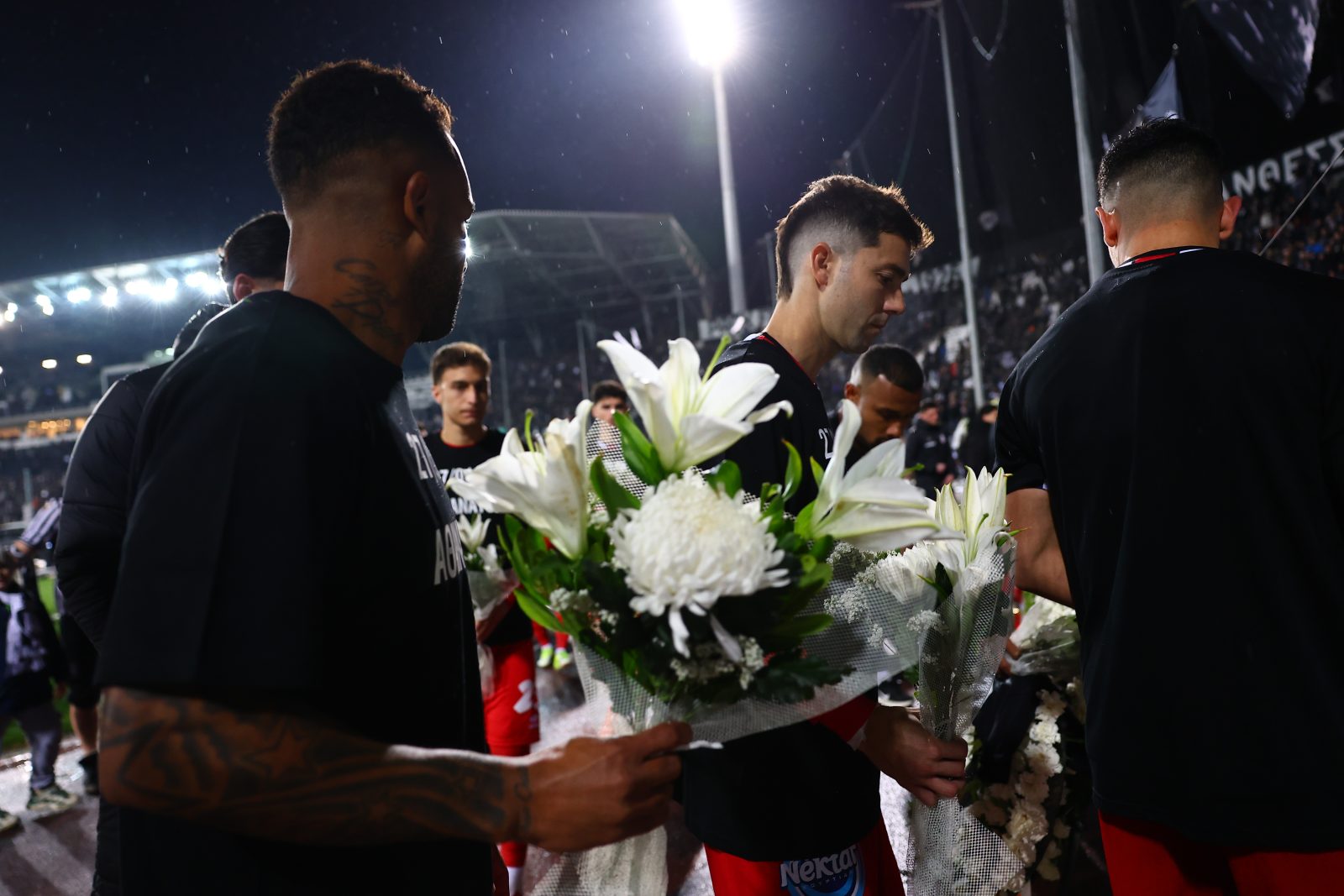 Πριν τη σέντρα στην αναμέτρηση κρατήθηκε ενός λεπτού σιγή η οποία ολοκληρώθηκε με το σύνθημα «αδέρφια ζείτε εσείς μας οδηγείτε». Ταυτόχρονα στη θύρα των οργανωμένων φίλων του ΠΑΟΚ άναψαν εκατοντάδες πυρσοί.