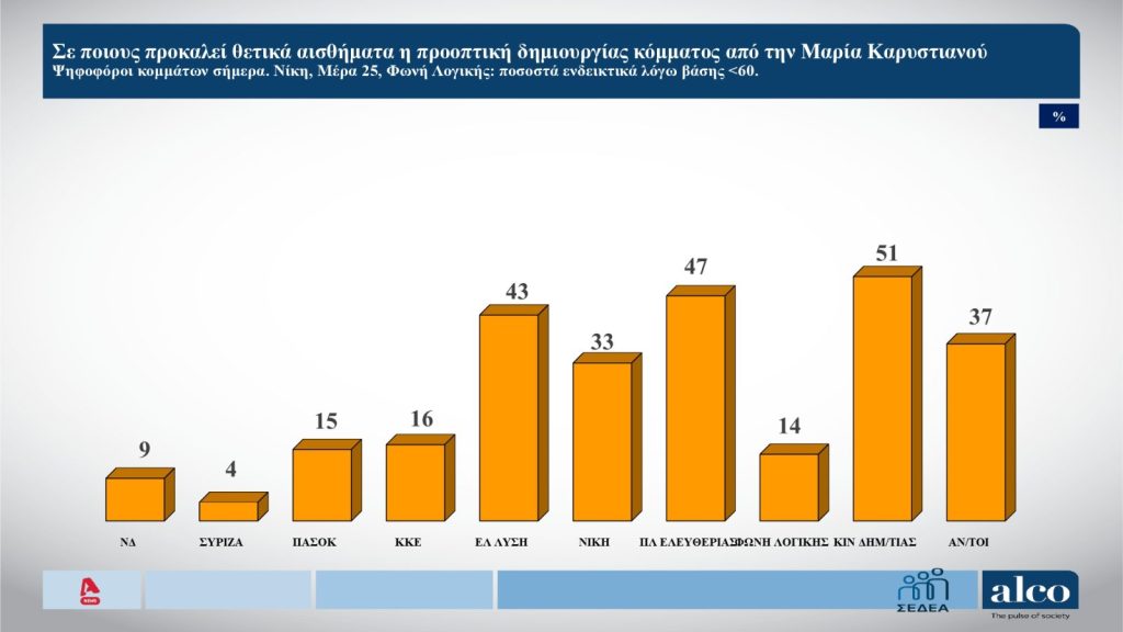 Ο ΣΥΡΙΖΑ συγκεντρώνει το 3,7%, η Φωνή Λογικής το 2,8%, το ΜέΡΑ25 το 2,6% και η Νίκη 2,2%. Το Κίνημα Δημοκρατίας φτάνει στο 1,8%, η Νέα Αριστερά στο 1,3%.