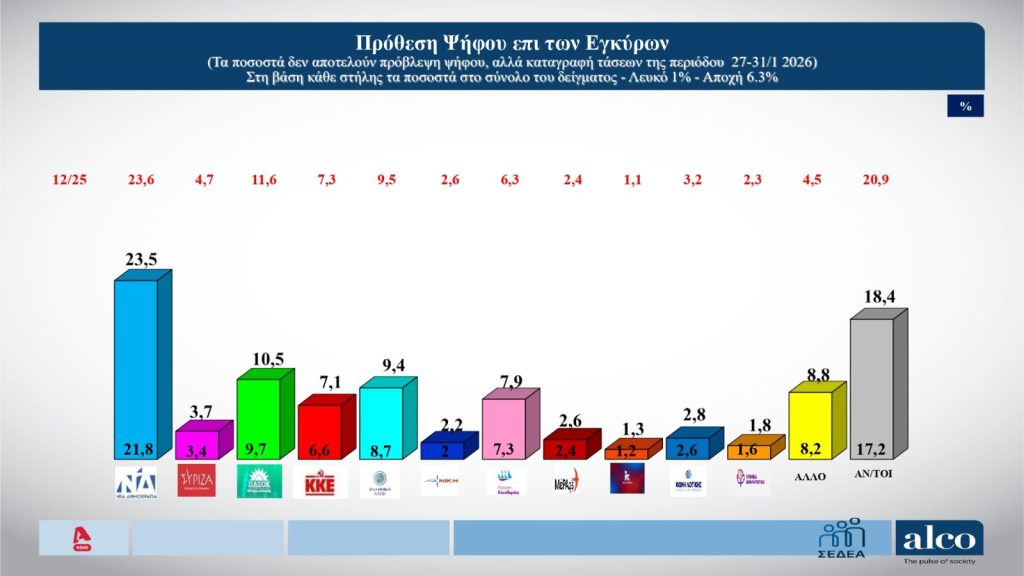 Πρώτο κόμμα με ποσοστό 23,5% παραμένει η ΝΔ, σύμφωνα με νέα δημοσκόπηση της ALCO για τον Alpha. Στην πρόθεση ψήφου επί των εγκύρων, δεύτερο έρχεται το ΠΑΣΟΚ με 10,5%. Ακολουθούν η Ελληνική Λύση με 9,4%, η Πλεύση Ελευθερίας με 7,9% και το ΚΚΕ 7,1%.