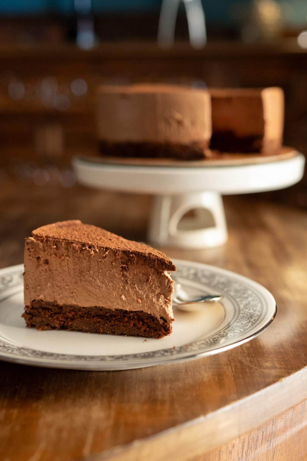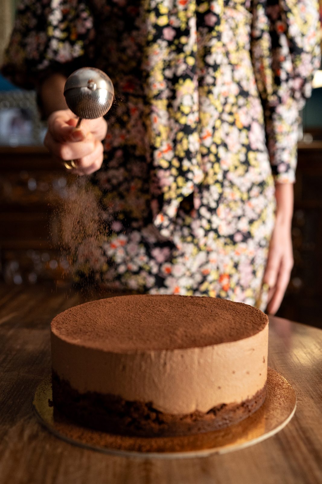 - Όταν κρυώσει τελείως ή, ακόμα καλύτερα, την επόμενη μέρα, χτυπάμε το σοκολατένιο μείγμα στο μίξερ μέχρι να αποκτήσουμε μια σταθερή μους. Την αδειάζουμε στη φόρμα όπου έχουμε τη βάση απλώνοντάς την ομοιόμορφα. Κοσκινίζουμε από πάνω αρκετό κακάο και αφήνουμε την τούρτα στο ψυγείο για 2-3 ώρες προτού την ξεφορμάρουμε και τη σερβίρουμε.