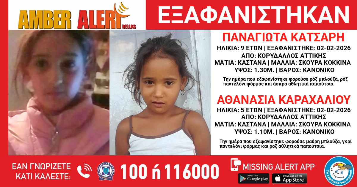 Στις 02/02/2026, και ώρα 15.00, εξαφανίστηκαν οι ανήλικες Παναγιώτα Κάτσαρη και Αθανασία Καραχάλιου, από τον Κορυδαλλό Αττικής και έκτοτε αγνοούνται. «Το Χαμόγελο του Παιδιού» ενημερώθηκε για την εξαφάνιση των ανήλικων και προχώρησε σήμερα 02/02/2026 κατόπιν εισαγγελικής εντολής στην ενεργοποίηση του μηχανισμού AMBER ALERT HELLAS.