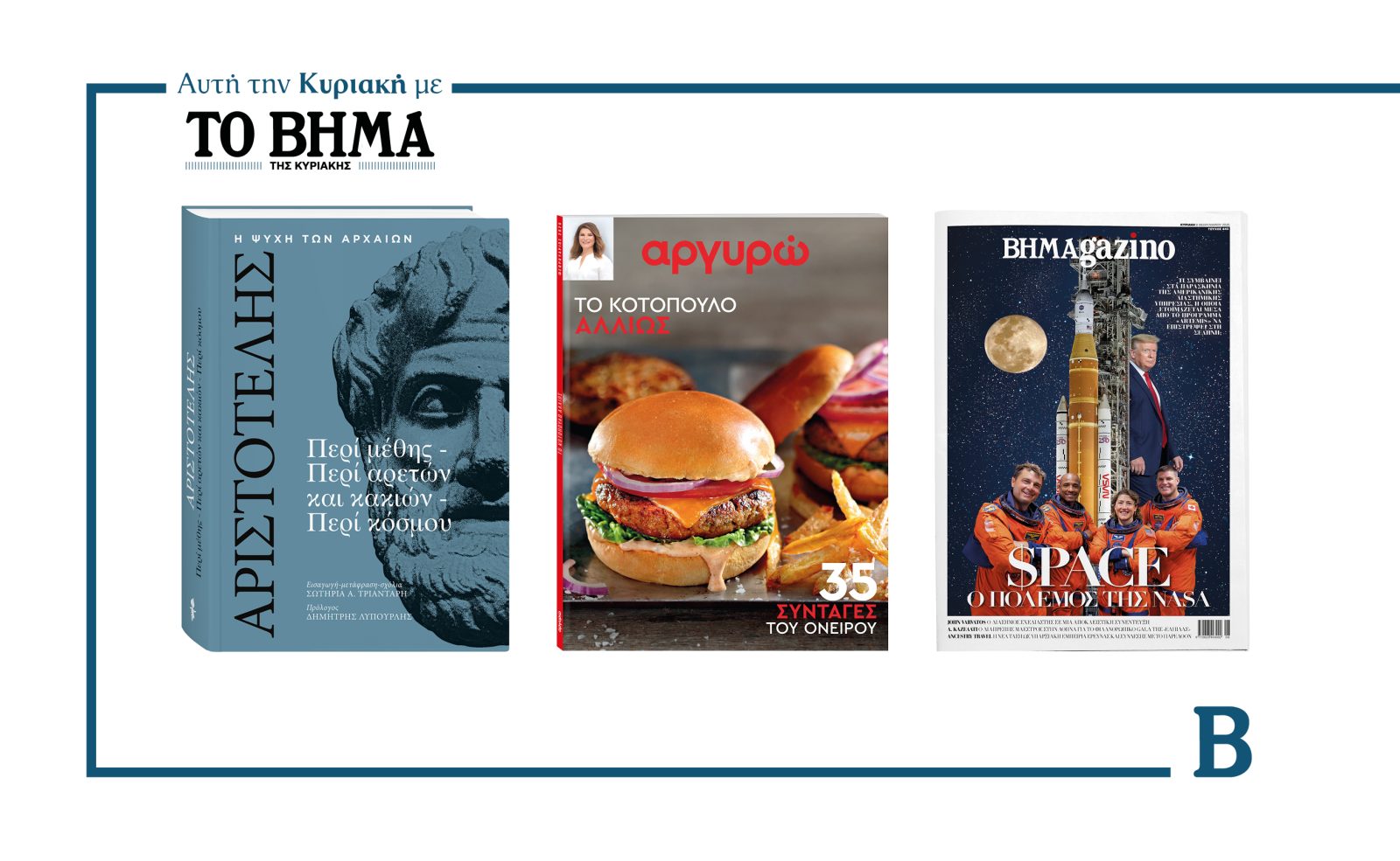 Την Κυριακή 8 Φεβρουαρίου το «Βήμα της Κυριακής» κυκλοφορεί με συναρπαστικές προσφορές: Οι τρείς πραγματείες του Αριστοτέλη «Περί Μέθης», «Περί Αρετών και Κακιών» και «Περί Κόσμου», το περιοδικό ΑΡΓΥΡΩ με 35 συνταγές και όπως κάθε Κυριακή, ΒΗΜΑGAZINO.