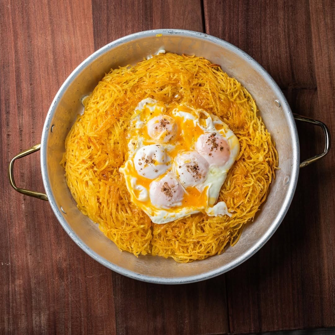 Μια τραγανή, χρυσαφένια φωλιά από τριμμένη τηγανητή πατάτα και στο κέντρο δύο ή τέσσερα μελάτα αβγά (αναλόγως το μέγεθος της παρέας), ψημένα τόσο ώστε, μόλις κοπούν, ο κρόκος να ποτίσει ολόκληρη τη φωλιά.