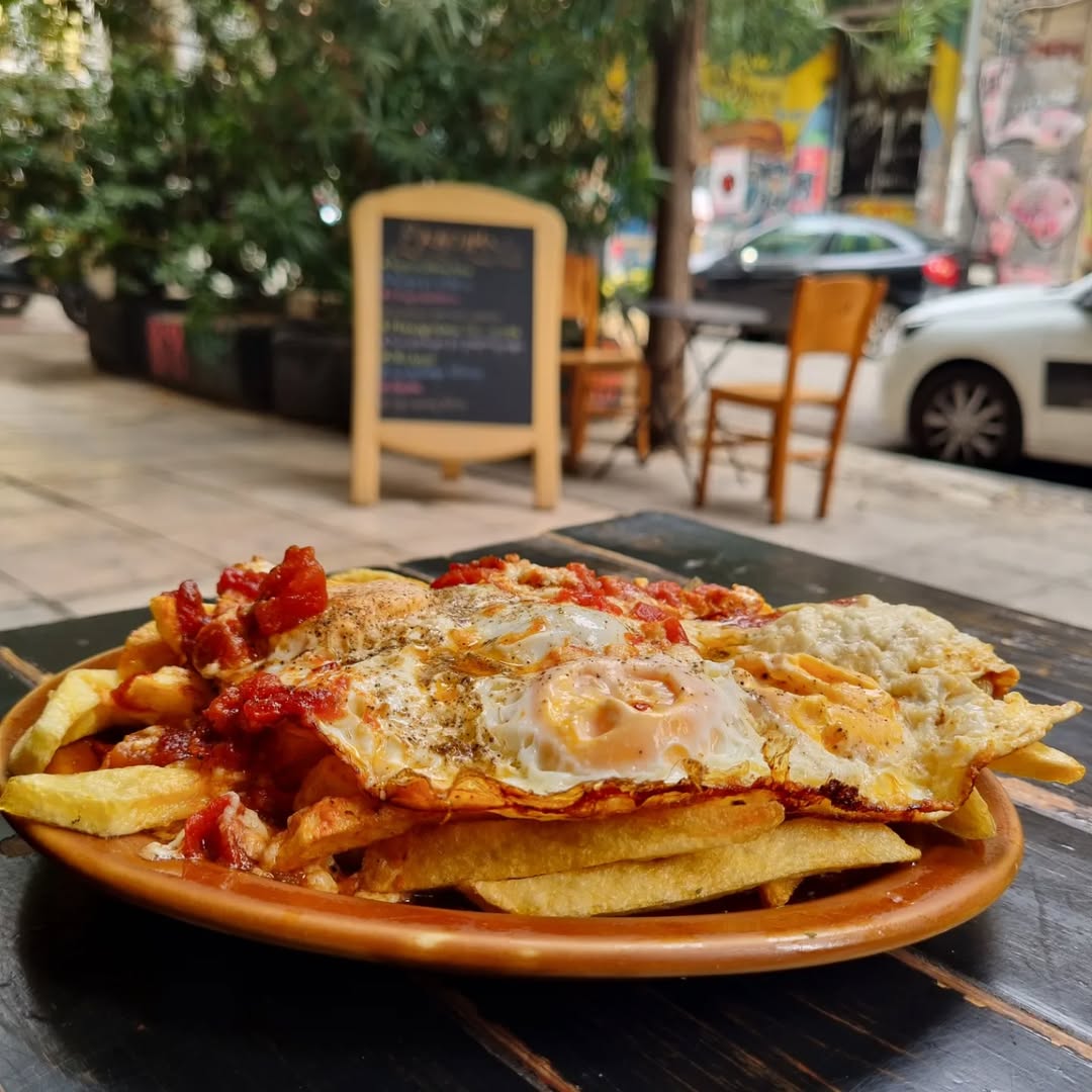 Τηγανητές πατάτες, αβγά, στάκα και σάλτσα ντομάτας στο Ρακουμέλ. Το μεγαλείο της απλότητας με φόντο τους δρόμους των Εξαρχείων. Φωτό: Instagram/rakoumel_exarhia