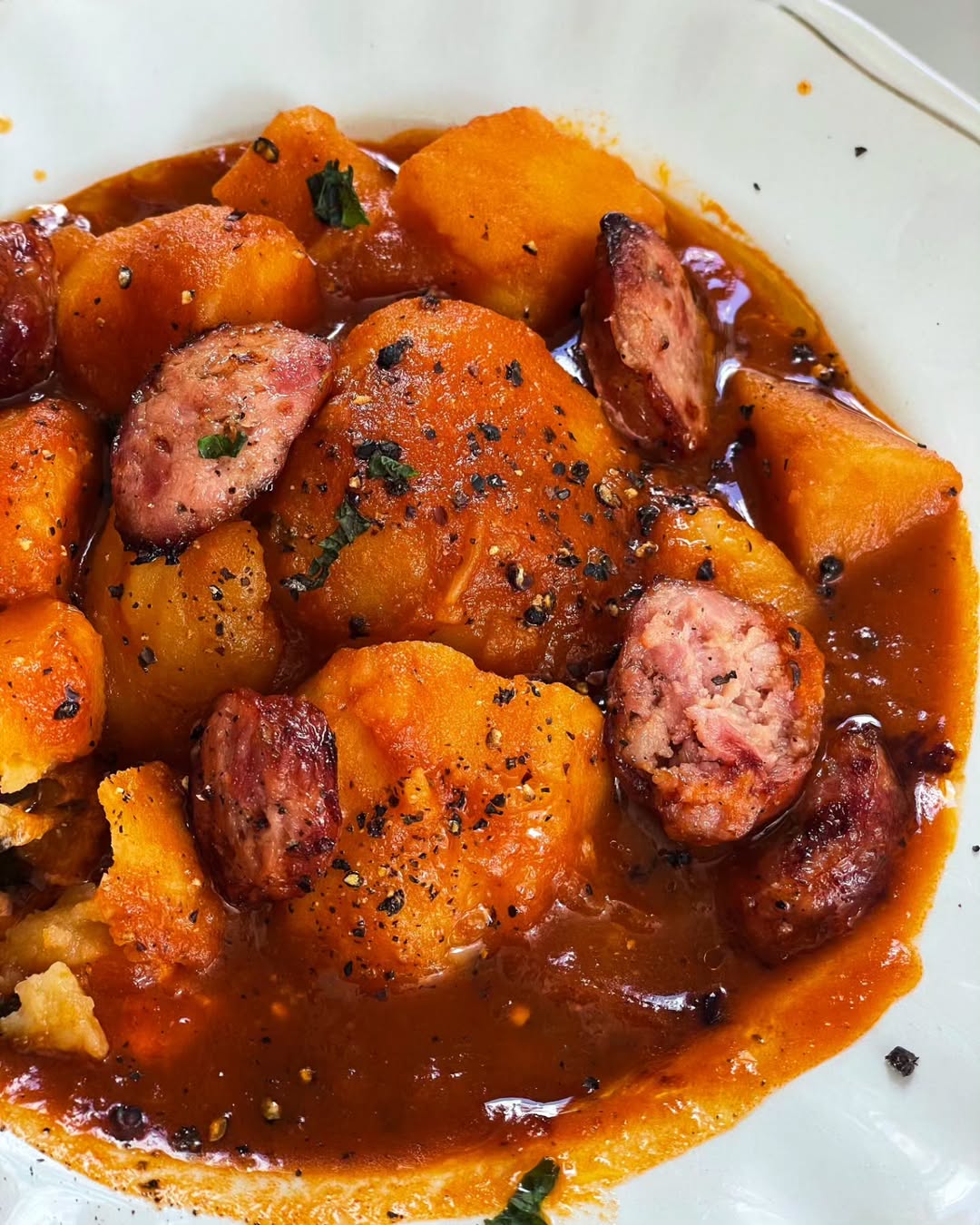 Πατάτες γιαχνί σαν αυτές που έφτιαχνε η γιαγιά, σερβιρισμένες με λουκάνικο μαύρο χοίρου στο Ρίνι. Φωτό: Instagram/torini_athens
