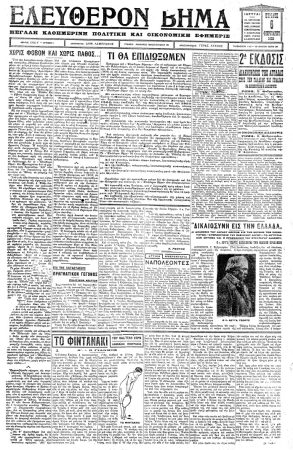 Στις 6 Φεβρουαρίου 1922 εκδίδεται το «ΕΛΕΥΘΕΡΟΝ ΒΗΜΑ», η «μεγάλη καθημερινή πολιτική και οικονομική εφημερίς», όπως αυτοσυστηνόταν. Μετά τον Β΄ Παγκόσμιο Πόλεμο, η εφημερίδα θα συνεχίσει με νέο τίτλο «ΤΟ ΒΗΜΑ», διατηρώντας ζωντανό το ίδιο εκδοτικό ήθος.