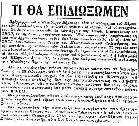 »Στο κύριο άρθρο του πρώτου φύλλου της νέας εφημερίδας τονίζεται ότι “το ‘Ελεύθερον Βήμα’ εμπνεόμενον από τας αρχάς εκείνας αίτινες επήγασαν εκ της λαϊκής εξεγέρσεως του 1909 θα καταβάλη πάσαν νόμιμον προσπάθειαν προς επικράτησιν τούτων εις την διακυβέρνησιν και την διοίκησιν. Αύτη δε πρέπει να εξασφαλίζη εις όλους τους πολίτας, ανεξαρτήτως των πολιτικών αυτών ιδεών, απόλυτον δημοσίαν τάξιν, ισότητα και δικαιοσύνην απηλλαγμένην από προσωπικάς εμπαθείας, την οποίαν κακός κομματικός άνεμος σπείρει εις το Κράτος ακόμη με βέβαιον τον κίνδυνον να θερίσωμεν όλοι μόνον κινδύνους…”.
