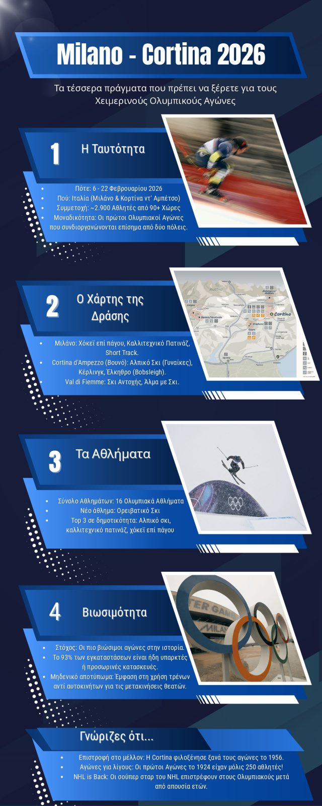 Σύμφωνα με τους διοργανωτές οι Χειμερινοί Ολυμπιακοί Αγώνες του 2026 υπόσχονται να συνδυάσουν την ιταλική φινέτσα, την ιστορία και την αγάπη για τον αθλητισμό. Με φόντο τις μαγευτικές Άλπεις, το Μιλάνο και η Κορτίνα ετοιμάζονται να υποδεχτούν τον κόσμο σε μια γιορτή που φιλοδοξεί να είναι η πιο οικολογική και βιώσιμη στην ιστορία του θεσμού.