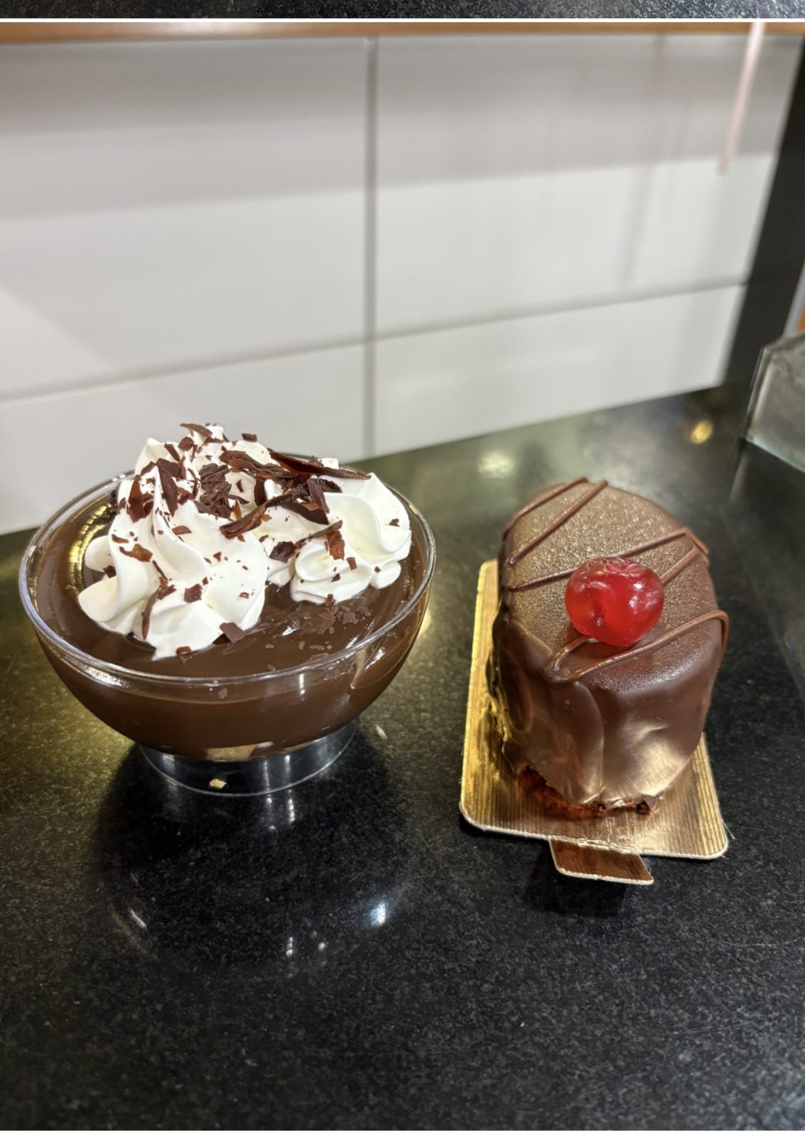 Πρόκειται για μια πραγματική βόμβα σοκολάτας, γι’ αυτό και η μικρότερη δόση. Κρέμα και παντεσπάνι σοκολάτας, μια λεπτή στρώση λευκού φοντάν και από πάνω πλούσια γκανάς. Υπάρχει και σε άλλες γεύσεις, αλλά αυτή είναι η αγαπημένη μας.