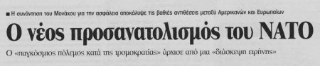 “Η Αμερική αρνείται να παραχωρήσει στην Ευρώπη τεχνογνωσία έτσι ώστε να καλυφθεί το τεχνολογικό χάσμα που τις χωρίζει”, ενώ ο γενικός γραμματέας της Συμμαχίας Τζορτζ Ρόμπερτσον, επιχειρούσε να γεφυρώσει το χάσμα, προτείνοντας αύξηση των ευρωπαϊκών αμυντικών δαπανών: