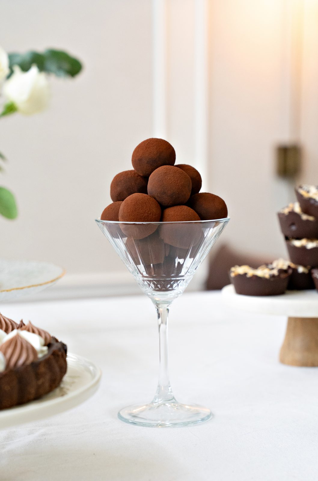 - Όταν σταθεροποιηθεί το μείγμα, παίρνουμε με ένα κουταλάκι του γλυκού μικρές ποσότητες και πλάθουμε μπαλάκια των 20-25 γρ. Τα κυλάμε σε κακάο ή τριμμένη καρύδα να επικαλυφθούν και τα αραδιάζουμε σε πιατέλα για να τα σερβίρουμε.