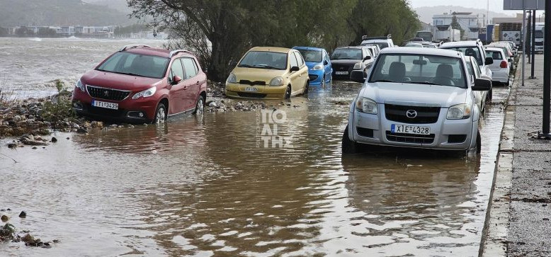 Ο παραλιακός δρόμος στον Βροντάδο είναι εξαιρετικά επικίνδυνος με το οδόστρωμα έχει γεμίσει με πέτρες και φύκια. Στο λιμάνι της Χίου η θάλασσα κυριολεκτικά βγήκε στη στεριά. Μπροστά από το Ξενοδοχείο «Χανδρής», το Λιμεναρχείο Χίου προχώρησε σε εκτροπή της κυκλοφορίας προκειμένου να αποφευχθεί ο κίνδυνος για οδηγούς και πεζούς. Επιβαρυμένη είναι η κατάσταση στην περιοχή του αεροδρομίου με δεκάδες Ι.Χ. κατά μήκος του δρόμου να είναι έρμαια των κυμάτων. Στην περιοχή ξεριζώθηκαν και δέντρα δίπλα στη θάλασσα.