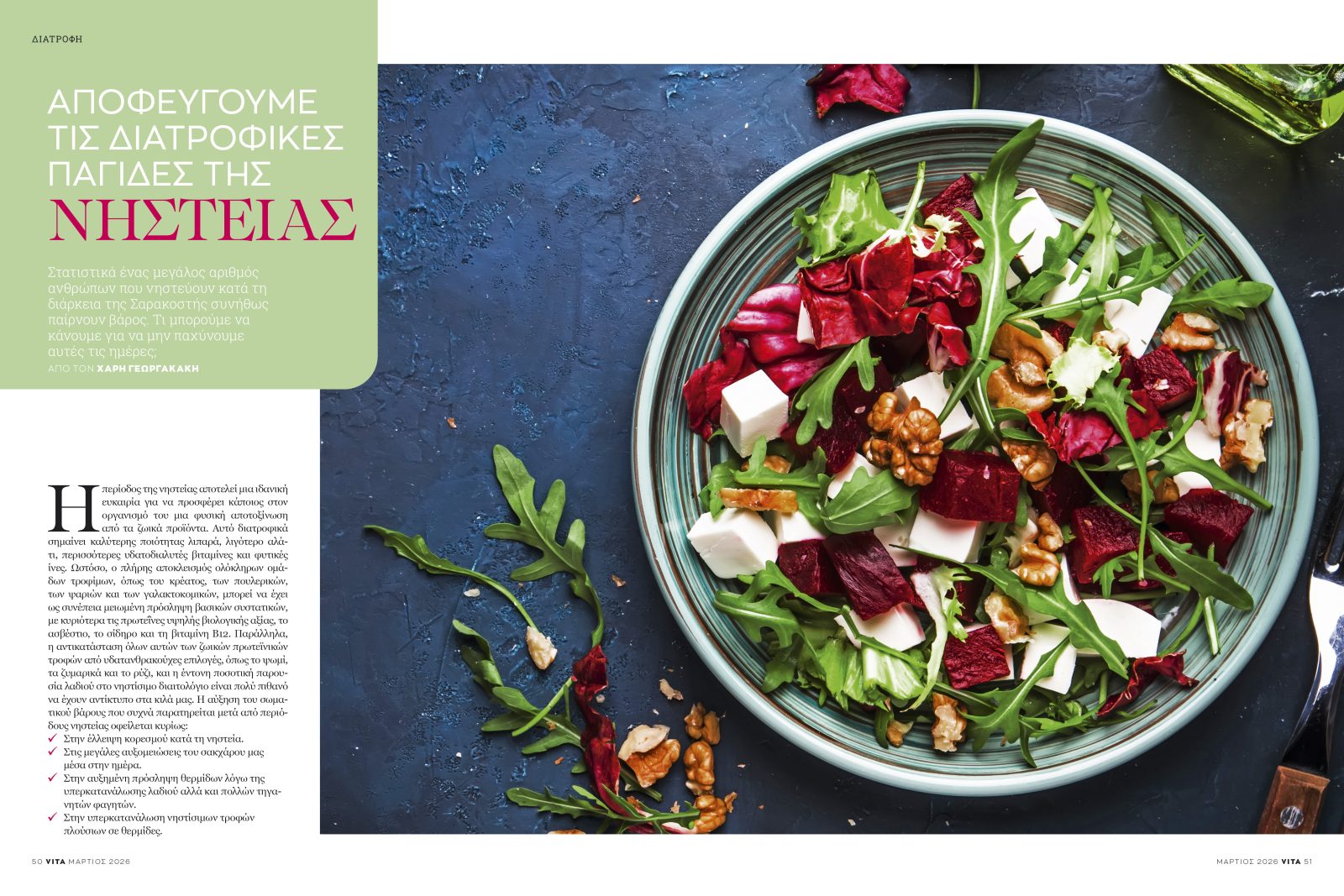 Και επειδή ο Μάρτης πλησιάζει, το περιοδικό δεν θα μπορούσε να αγνοήσει τη Σαρακοστή. Φωτίζει τις διατροφικές παγίδες της νηστείας και προτείνει ισορροπημένες λύσεις για να νηστεύουμε σωστά και θρεπτικά, ενώ παράλληλα προσφέρει απολαυστικές συνταγές για το τραπέζι της Καθαράς Δευτέρας.