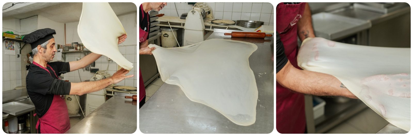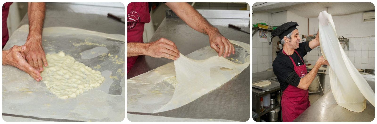 Η διαδικασία απαιτεί υπομονή. «Ξεκινάς να ζυμώνεις από τα χαράματα και μέχρι να ανοίξεις φύλλο έχουν περάσει τέσσερις με πέντε ώρες». Η ζύμη είναι ευαίσθητη. «Πολύ εύκολα σαπίζει, πολύ εύκολα σφίγγει». Καταλαβαίνουμε ότι δεν είναι απλώς τεχνική, είναι σχέση που πρέπει να φροντίζεις κάθε λεπτό. Για τον Φίλιππο βέβαια, είναι και ένας από τους βασικούς λόγους για τους οποίους αγάπησε τόσο τη συγκεκριμένη δουλειά. «Το άνοιγμα του φύλλου της μπουγάτσας λειτουργεί ως ένα είδος ψυχοθεραπείας», μας λέει ο ίδιος. «Το πλάσιμο του ζυμαριού για μένα, ειδικά όταν είμαι μόνος στο εργαστήριο, εγώ και η μουσική μου, είναι λυτρωτικό».