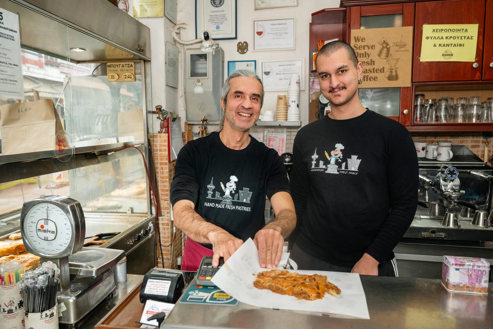Ο Φίλιππος με το γιο του, Δημήτρη, ο οποίος, παράλληλα με τις σπουδές του στη Σχολή Καλών Τεχνών, βοηθά στο κατάστημα. Φωτό: Αλέξανδρος Αλεξανδρής