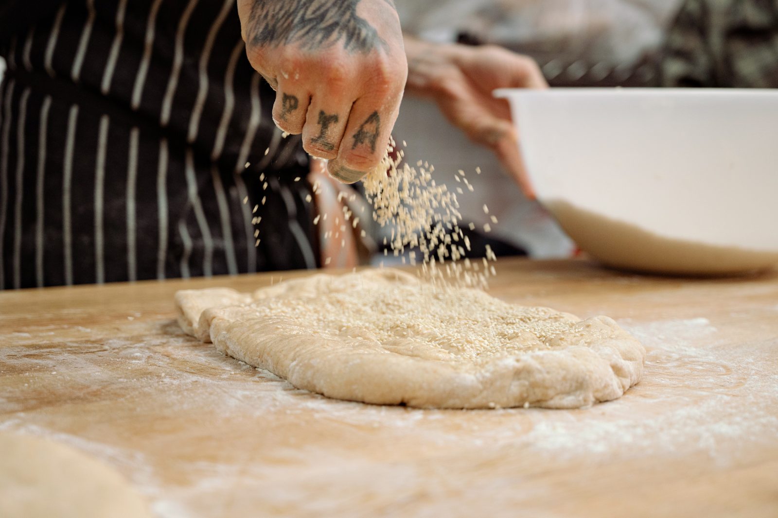 - Διαλύουμε στο νερό τη μαγιά και τη ζάχαρη. Αν χρησιμοποιούμε προζύμι, το βάζουμε εδώ. Προσθέτουμε το αλεύρι και ζυμώνουμε για 4-5 λεπτά με το γάντζο του μίξερ σε αργή ταχύτητα. Στη συνέχεια, προσθέτουμε το αλάτι, το ελαιόλαδο και το σησαμέλαιο και ζυμώνουμε για άλλα 6-8 λεπτά σε μεσαία ταχύτητα. Η θερμοκρασία της ζύμης πρέπει να είναι 24–26°C. Τη σκεπάζουμε και την αφήνουμε να ξεκουραστεί για 30-40 λεπτά.