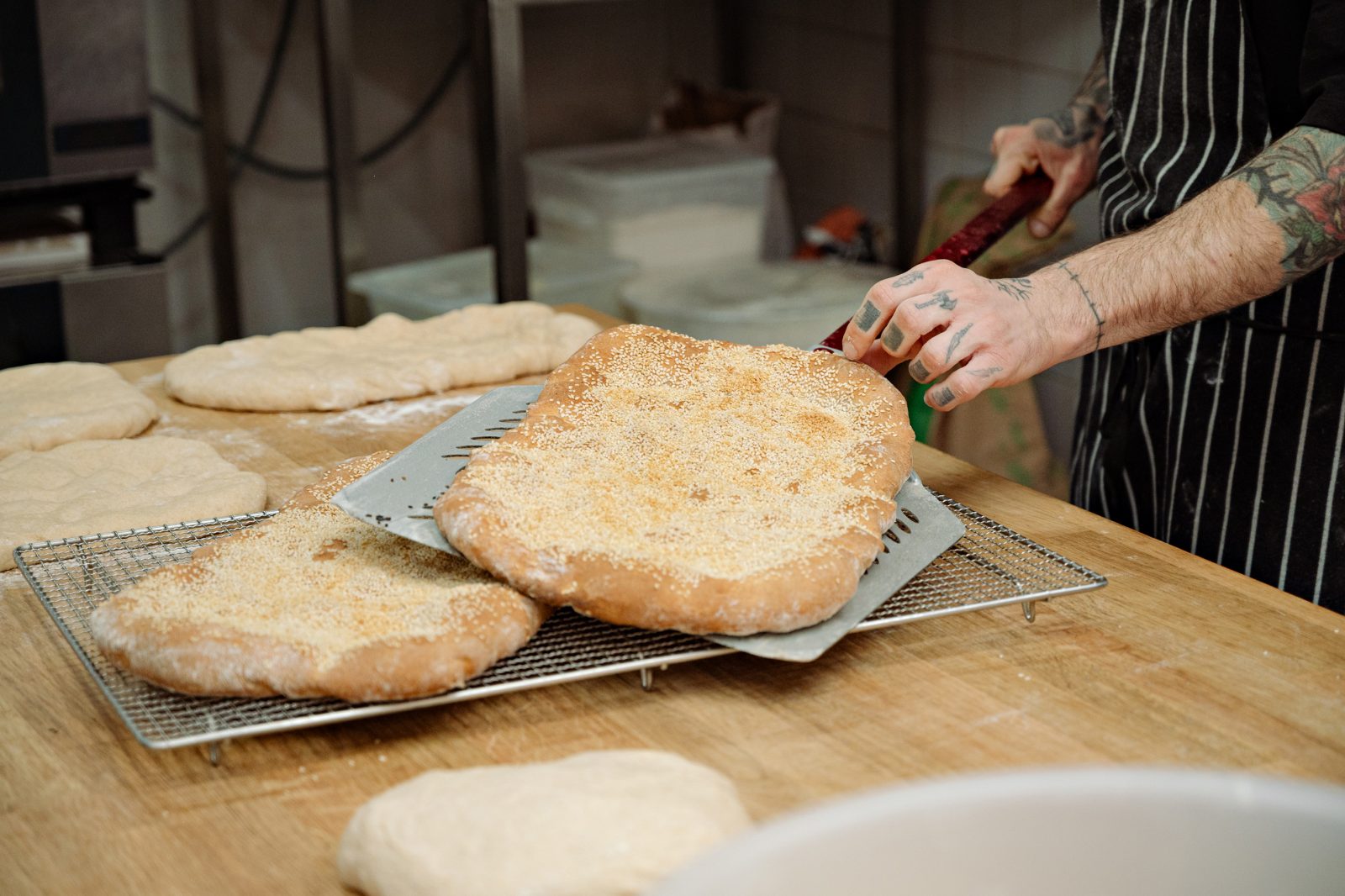 - Χωρίζουμε τη ζύμη σε 5 κομμάτια, πλάθουμε 5 λαγάνες των 500 γραμμαρίων η καθεμιά και τους δίνουμε οβάλ σχήμα. Τις αφήνουμε να ξεουραστούν για άλλα 15-20 λεπτά. Στη συνέχεια, πιέζουμε την επιφάνεια κάνοντας τις χαρακτηριστικές δαχτυλιές. Αλείφουμε με το ζαχαρόνερο και πασπαλίζουμε με το σουσάμι. Τέλος, ξεκουράζουμε για άλλα 35-45 λεπτά.