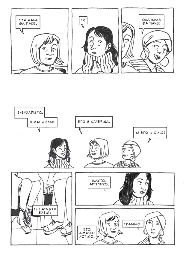 Το κόμικ «Ιστορίες από την αίθουσα αναμονής» από τις εκδόσεις Μεταίχμιο βασίστηκε σε 25 συνεντεύξεις γυναικών που νόσησαν από καρκίνο και θέλησαν να μιλήσουν ανοιχτά για το άγχος, τον φόβο, την κατάρρευση της πρώτης διάγνωσης, την επίδραση της ασθένειας στην αυτοεικόνα και τις σχέσεις τους, για τη σημασία της πρόληψης και τελικά για την ελπίδα.